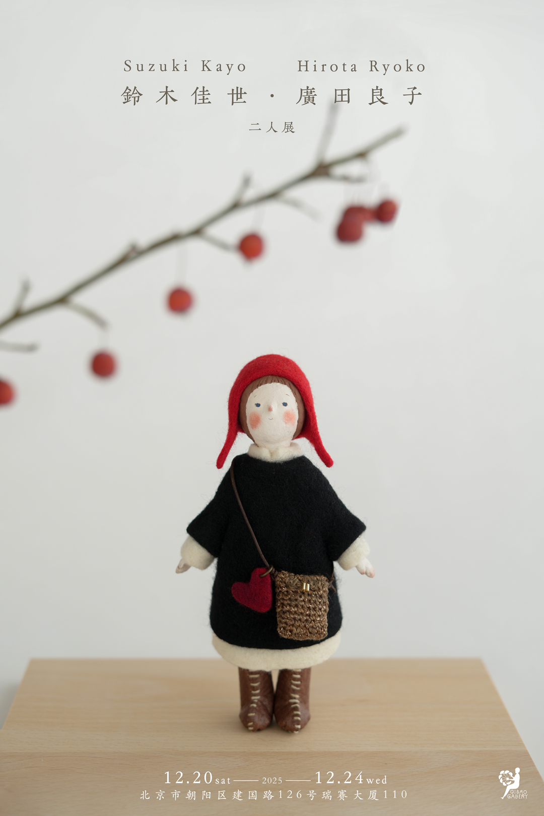 我很高兴地宣布,我将与铃木佳代在北京举办双人展。 主视觉海报是我们合作的作品,铃木负责创作陶瓷女孩,而广田负责创作服装和配饰。我观察着女孩的姿态,天马行空地想象着,“什么样的服装才适合这个女孩呢?”我创作了几件作品,每一件都展现了不同的神韵,希望大家喜欢。 两位艺术家的其他作品也将同时展出和出售。我带来了动物造型的饰品、胸针、包饰、熊和猫咪造型的手机套、收纳袋等等。 展览首日,广田还将举办羊毛毡工作坊,欢迎大家前来体验。 非常感谢。